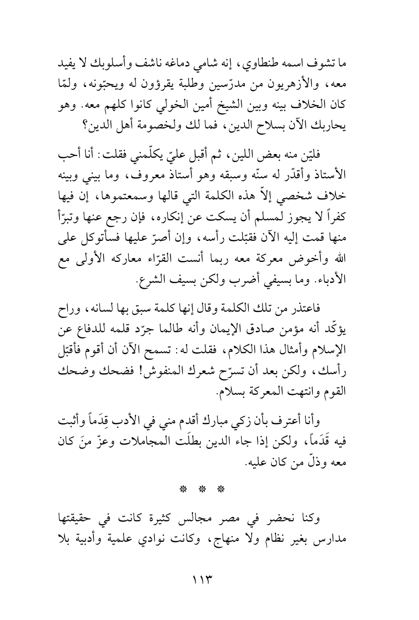 ما تشوف اسمه طنطاوي، إنه شامي دماغه ناشف وأسلوبك لايفيد معه، والأزهريون من مدرّسين وطلبة يقرؤون له ويحبّونه، ولمّا كان الخلاف بينه وبين الشيخ أمين الخولي كانوا كلهم معه. وهو يحاربك الآن بسلاح الدين، فما لك ولخصومة أهل الدين؟