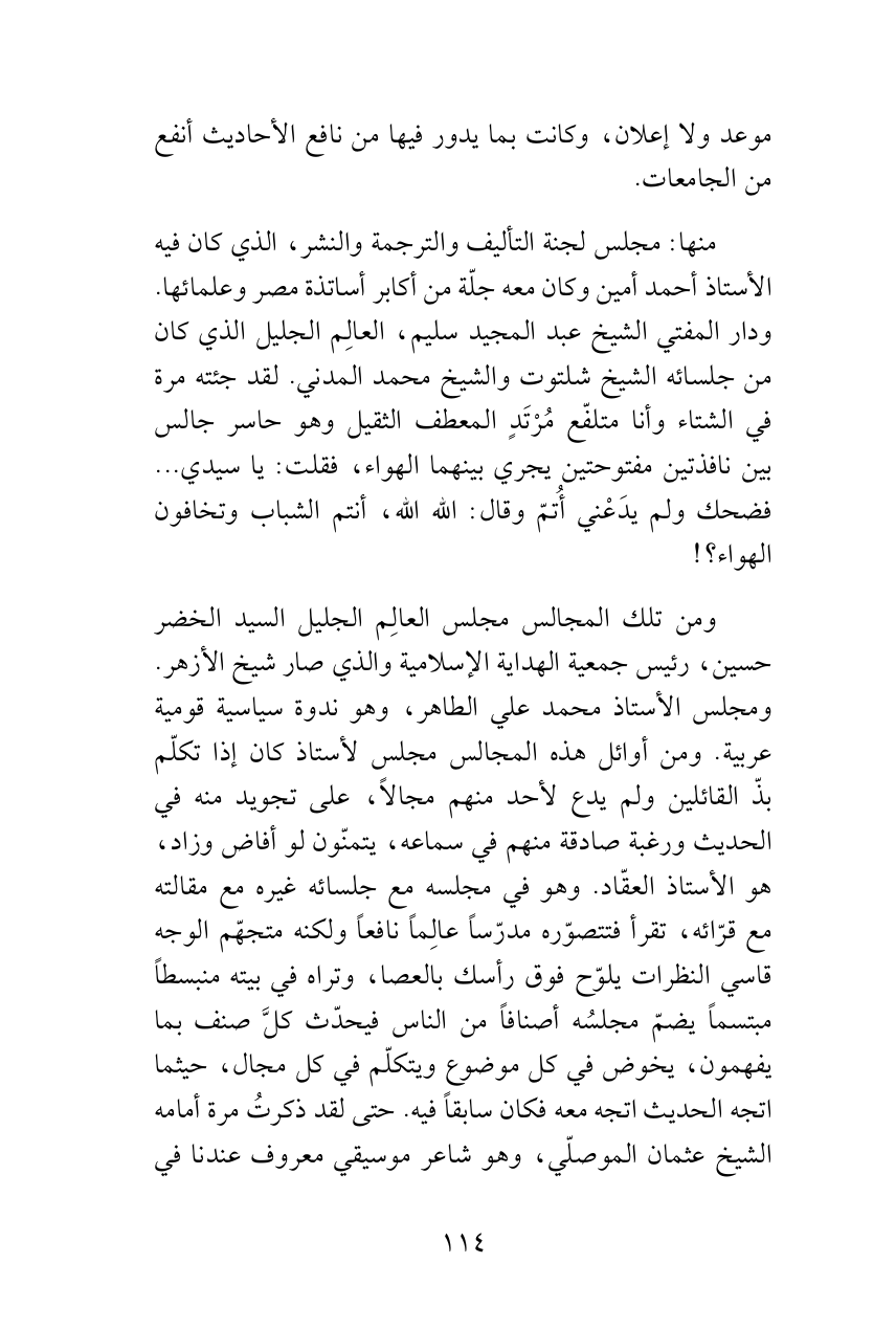 منها: مجلس لجنة التأليف والترجمة والنشر، الذي كان فيه الأستاذ أحمد أمين وكان معه جلّة من أكابر أساتذة مصر وعلمائها. ودار المفتي الشيخ عبد المجيد سليم، العالِم الجليل الذي كان من جلسائه الشيخ شلتوت والشيخ محمد المدني. لقد جئته مرة في الشتاء وأنا متلفّع مُرْتَدٍ المعطف الثقيل وهو حاسر جالس بين نافذتين مفتوحتين يجري بينهما الهواء، فقلت: ياسيدي ... فضحك ولم يدَعْني أُتمّ وقال: الله الله، أنتم الشباب وتخافون الهواء؟!