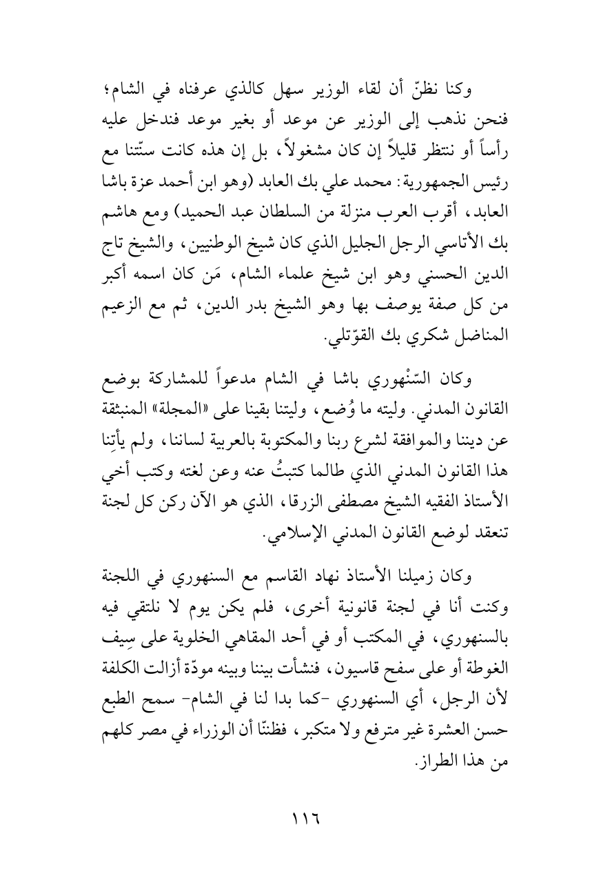 وكان السّنْهوري باشا في الشام مدعواً للمشاركة بوضع القانون المدني. وليته ما وُضع، وليتنا بقينا على «المجلة» المنبثقة عن ديننا والموافقة لشرع ربنا والمكتوبة بالعربية لساننا، ولم يأتِنا هذا القانون المدني الذي طالما كتبتُ عنه وعن لغته وكتب أخي الأستاذ الفقيه الشيخ مصطفى الزرقا، الذي هو الآن ركن كل لجنة تنعقد لوضع القانون المدني الإسلامي.