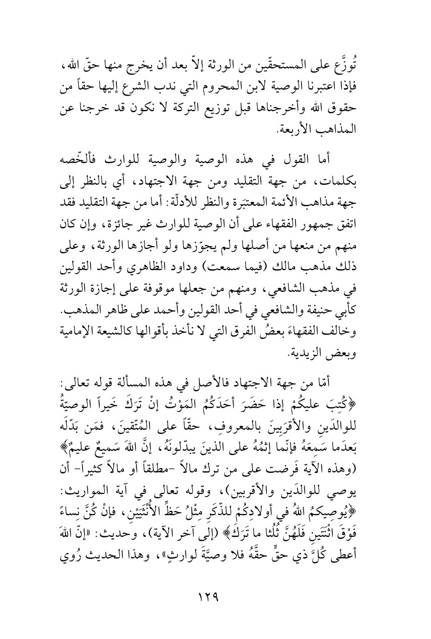 أما القول في هذه الوصية والوصية للوارث فألخّصه بكلمات، من جهة التقليد ومن جهة الاجتهاد، أي بالنظر إلى جهة مذاهب الأئمة المعتبَرة والنظر للأدلّة: أما من جهة التقليد فقد اتفق جمهور الفقهاء على أن الوصية للوارث غير جائزة، وإن كان منهم من منعها من أصلها ولم يجوّزها ولو أجازها الورثة، وعلى ذلك مذهب مالك (فيما سمعت) وداود الظاهري وأحد القولين في مذهب الشافعي، ومنهم من جعلها موقوفة على إجازة الورثة كأبي حنيفة والشافعي في أحد القولين وأحمد على ظاهر المذهب. وخالف الفقهاءَ بعضُ الفرق التي لا نأخذ بأقوالها كالشيعة الإمامية وبعض الزيدية.