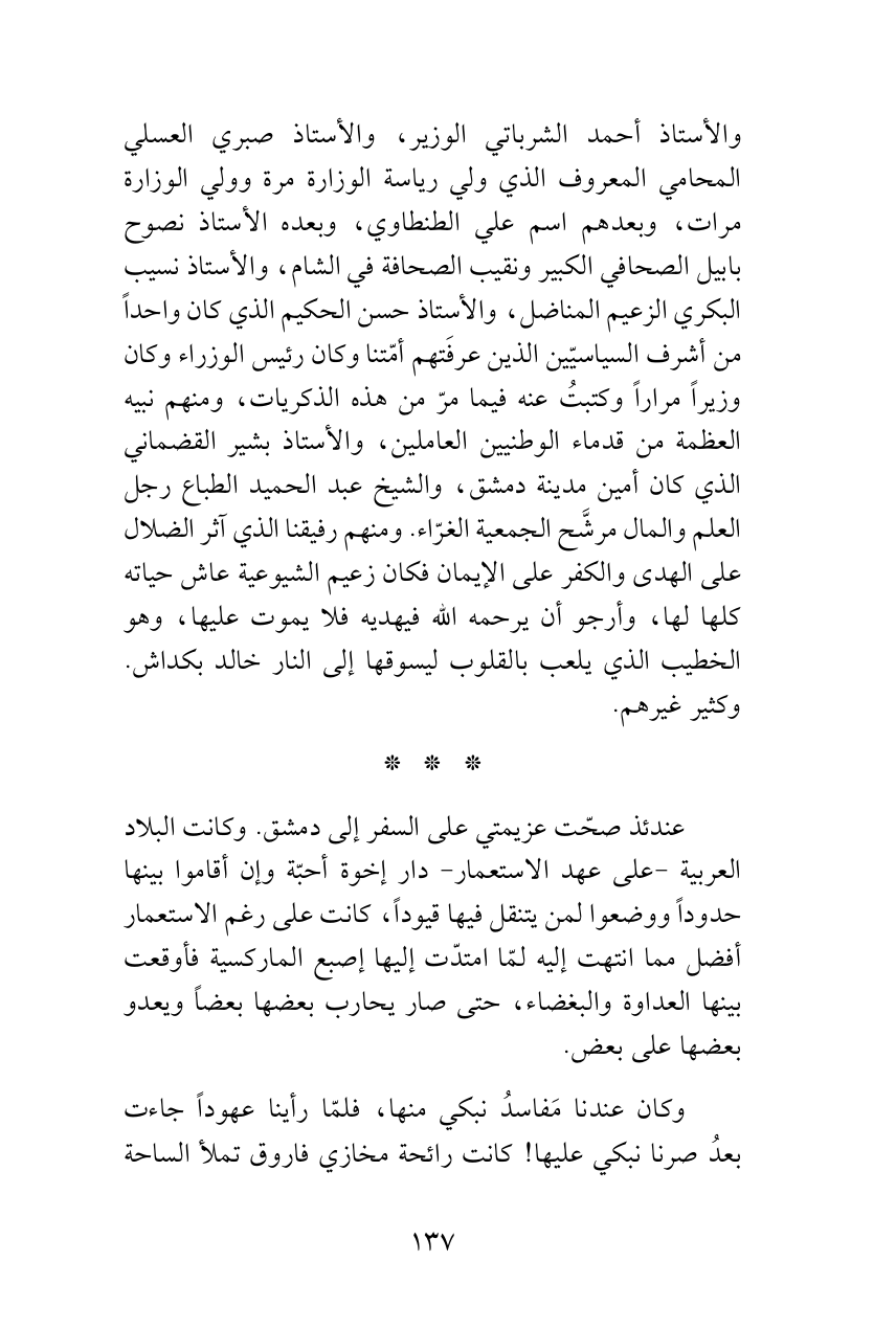 عندئذ صحّت عزيمتي على السفر إلى دمشق. وكانت البلاد العربية -على عهد الاستعمار- دار إخوة أحبّة وإن أقاموا بينها حدوداً ووضعوا لمن يتنقل فيها قيوداً، كانت على رغم الاستعمار أفضل مما انتهت إليه لمّا امتدّت إليها إصبع الماركسية فأوقعت بينها العداوة والبغضاء، حتى صار يحارب بعضها بعضاً ويعدو بعضها على بعض.
