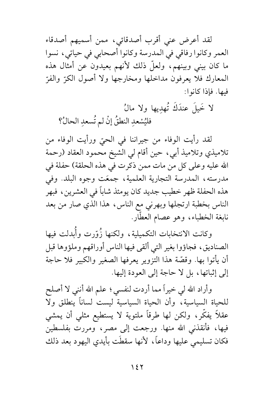 لقد أعرض عني أقرب أصدقائي، ممن أسميهم أصدقاء العمر وكانوا رفاقي في المدرسة وكانوا أصحابي في حياتي، نسوا ما كان بيني وبينهم، ولعلّ ذلك لأنهم بعيدون عن أمثال هذه المعارك فلا يعرفون مداخلها ومخارجها ولا أصول الكرّ والفرّ فيها. فإذا كانوا: