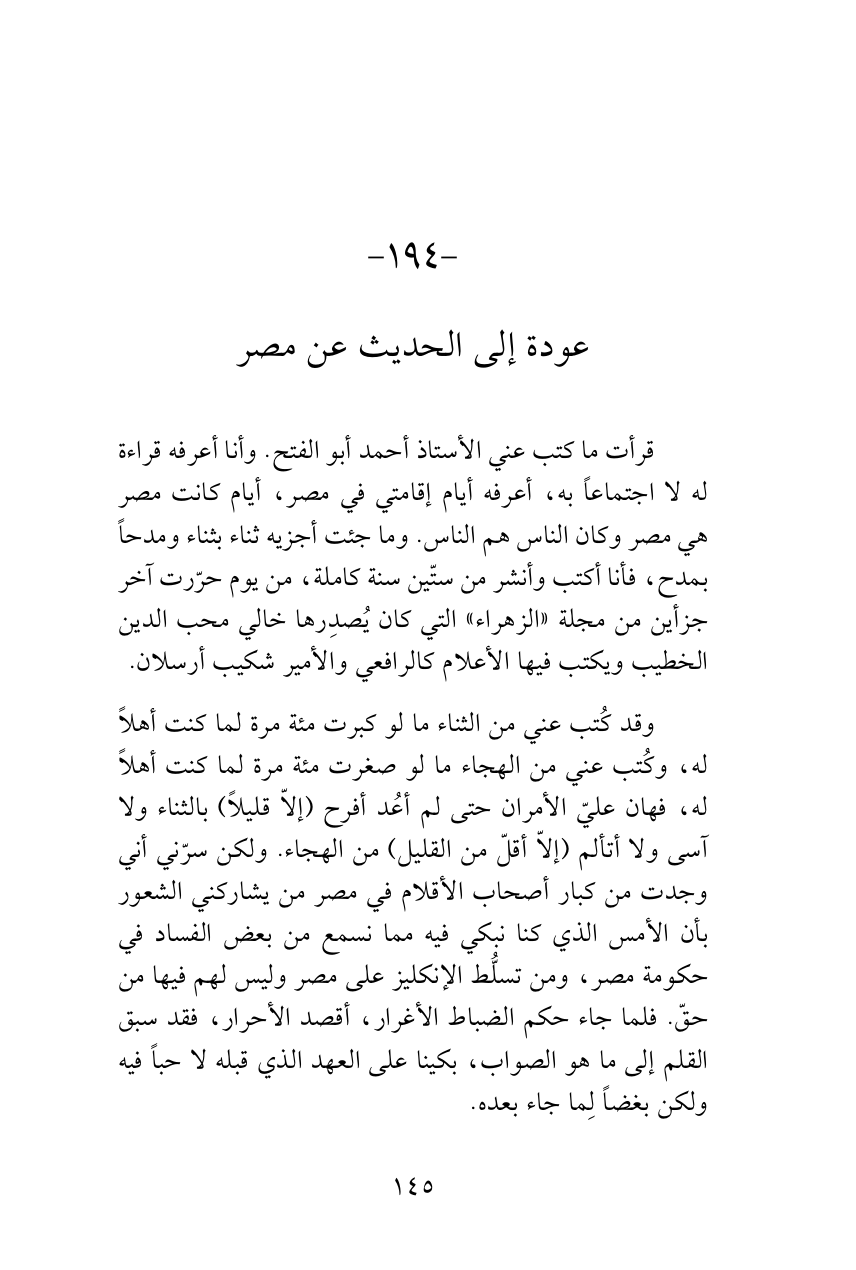 وقد كُتب عني من الثناء ما لو كبرت مئة مرة لما كنت أهلاً له، وكُتب عني من الهجاء ما لو صغرت مئة مرة لما كنت أهلاً له، فهان عليّ الأمران حتى لم أعُد أفرح (إلاّ قليلاً) بالثناء ولا آسى ولا أتألم (إلاّ أقلّ من القليل) من الهجاء. ولكن سرّني أني وجدت من كبار أصحاب الأقلام في مصر من يشاركني الشعور بأن الأمس الذي كنا نبكي فيه مما نسمع من بعض الفساد في حكومة مصر، ومن تسلُّط الإنكليز على مصر وليس لهم فيها من حقّ. فلما جاء حكم الضباط الأغرار، أقصد الأحرار، فقد سبق القلم إلى ما هو الصواب، بكينا على العهد الذي قبله لا حباً فيه ولكن بغضاً لِما جاء بعده.