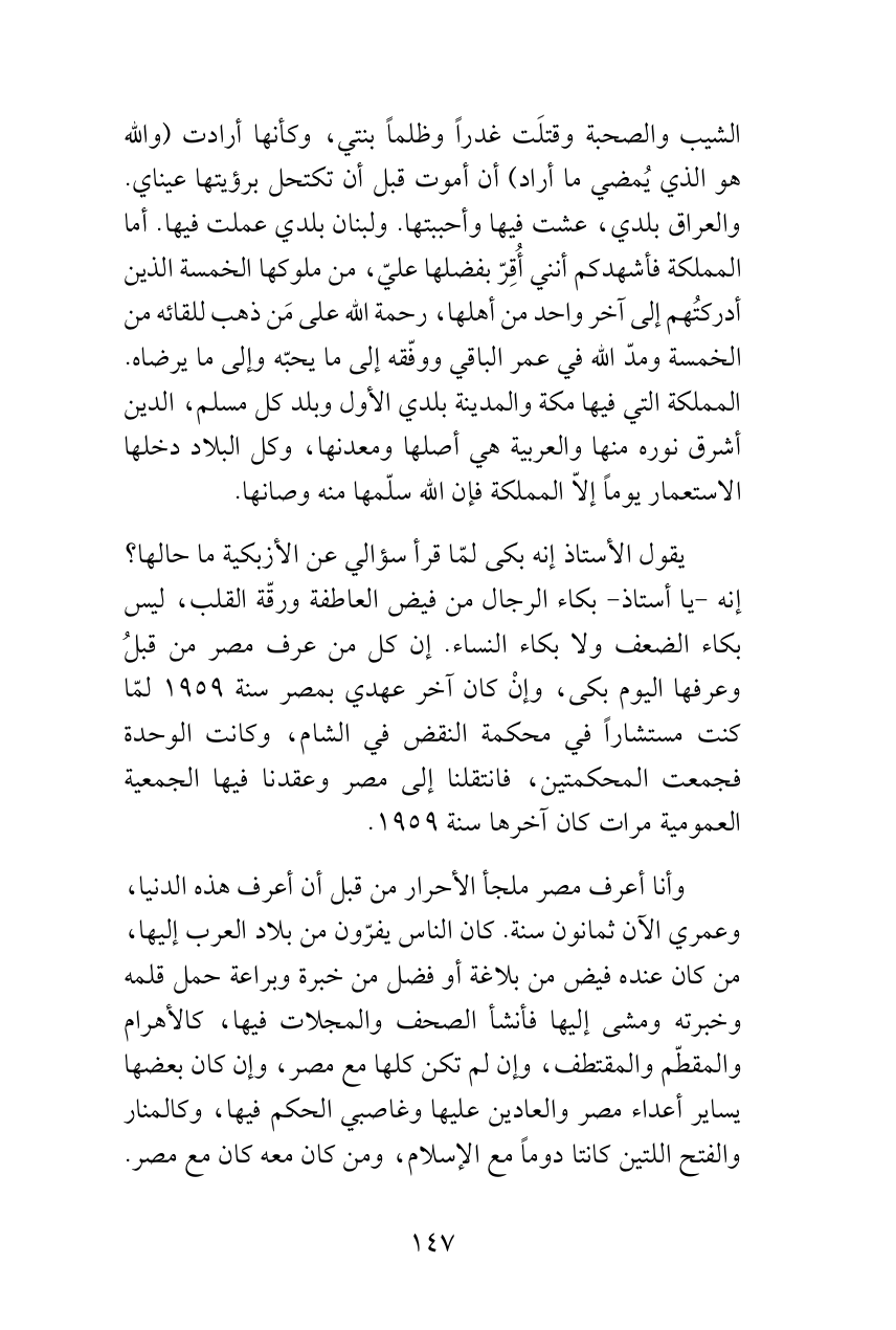 يقول الأستاذ إنه بكى لمّا قرأ سؤالي عن الأزبكية ما حالها؟ إنه -يا أستاذ- بكاء الرجال من فيض العاطفة ورقّة القلب، ليس بكاء الضعف ولا بكاء النساء. إن كل من عرف مصر من قبلُ وعرفها اليوم بكى، وإنْ كان آخر عهدي بمصر سنة 1959 لمّا كنت مستشاراً في محكمة النقض في الشام، وكانت الوحدة فجمعت المحكمتين، فانتقلنا إلى مصر وعقدنا فيها الجمعية العمومية مرات كان آخرها سنة 1959.