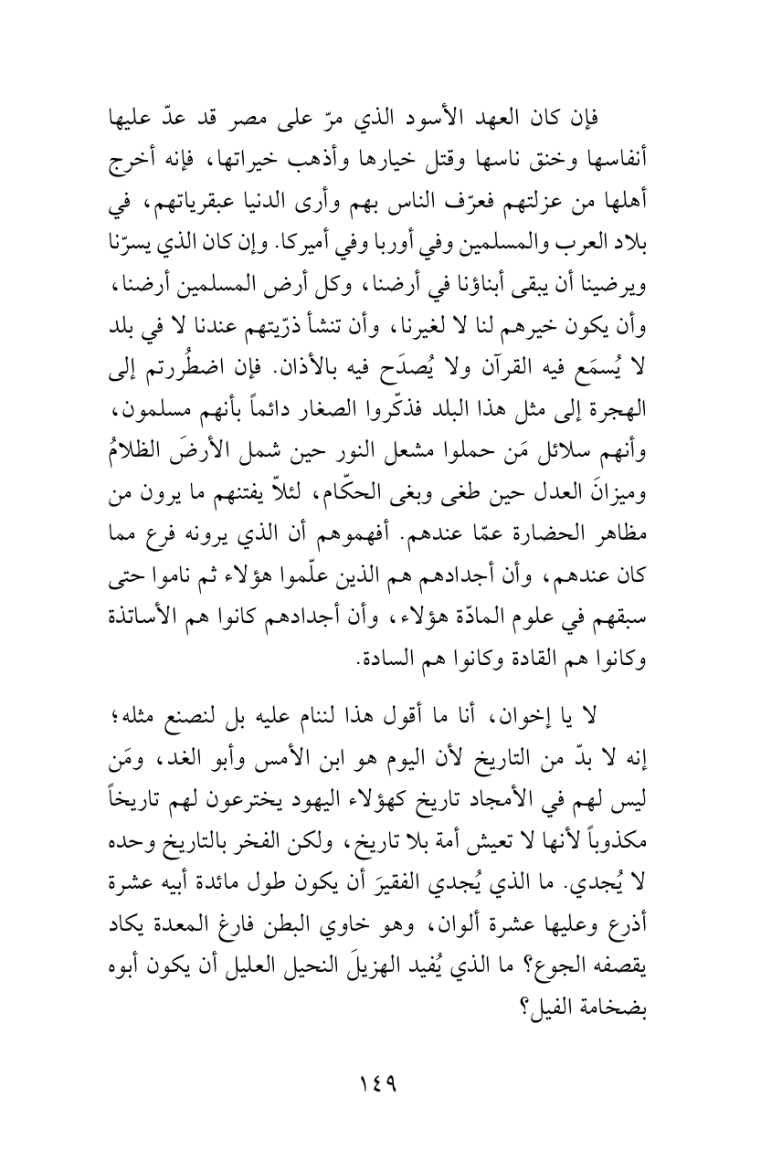 لا ياإخوان، أنا ما أقول هذا لننام عليه بل لنصنع مثله؛ إنه لا بدّ من التاريخ لأن اليوم هو ابن الأمس وأبو الغد، ومَن ليس لهم في الأمجاد تاريخ كهؤلاء اليهود يخترعون لهم تاريخاً مكذوباً لأنها لا تعيش أمة بلا تاريخ، ولكن الفخر بالتاريخ وحده لا يُجدي. ما الذي يُجدي الفقيرَ أن يكون طول مائدة أبيه عشرة أذرع وعليها عشرة ألوان، وهو خاوي البطن فارغ المعدة يكاد يقصفه الجوع؟ ما الذي يُفيد الهزيلَ النحيل العليل أن يكون أبوه بضخامة الفيل؟