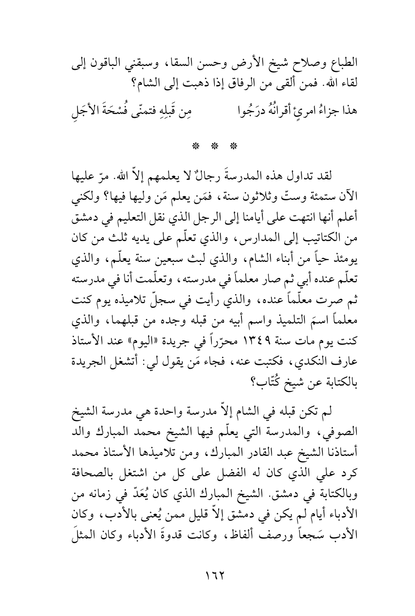 لم تكن قبله في الشام إلاّ مدرسة واحدة هي مدرسة الشيخ الصوفي، والمدرسة التي يعلّم فيها الشيخ محمد المبارك والد أستاذنا الشيخ عبد القادر المبارك، ومن تلاميذها الأستاذ محمد كرد علي الذي كان له الفضل على كل من اشتغل بالصحافة وبالكتابة في دمشق. الشيخ المبارك الذي كان يُعَدّ في زمانه من الأدباء أيام لم يكن في دمشق إلاّ قليل ممن يُعنى بالأدب، وكان الأدب سَجعاً ورصف ألفاظ، وكانت قدوةَ الأدباء وكان المثلَ