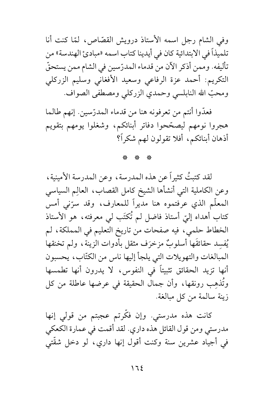 وفي الشام رجل اسمه الأستاذ درويش القصّاص، لمّا كنت أنا تلميذاً في الابتدائية كان في أيدينا كتاب اسمه «مبادئ الهندسة» من تأليفه. وممن أذكر الآن من قدماء المدرّسين في الشام ممن يستحقّ التكريم: أحمد عزة الرفاعي وسعيد الأفغاني وسليم الزركلي ومحبّ الله النابلسي وحمدي الزركلي ومصطفى الصواف.