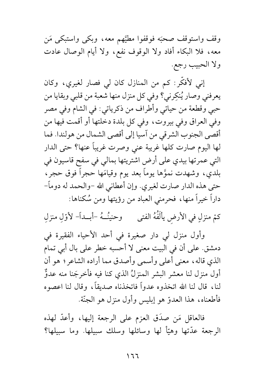 وأول منزل لي دار صغيرة في أحد الأحياء الفقيرة في دمشق. على أن في البيت معنى لا أحسبه خطر على بال أبي تمام الذي قاله، معنى أعلى وأسمى وأصدق مما أراده الشاعر؛ هو أن أول منزل لنا معشر البشر المنزلُ الذي كنا فيه فأخرجَنا منه عدوٌّ لنا، قال لنا الله اتخذوه عدواً فاتخذناه صديقاً، وقال لنا اعصوه فأطعناه، هذا العدوّ هو إبليس وأول منزل هو الجنّة.
