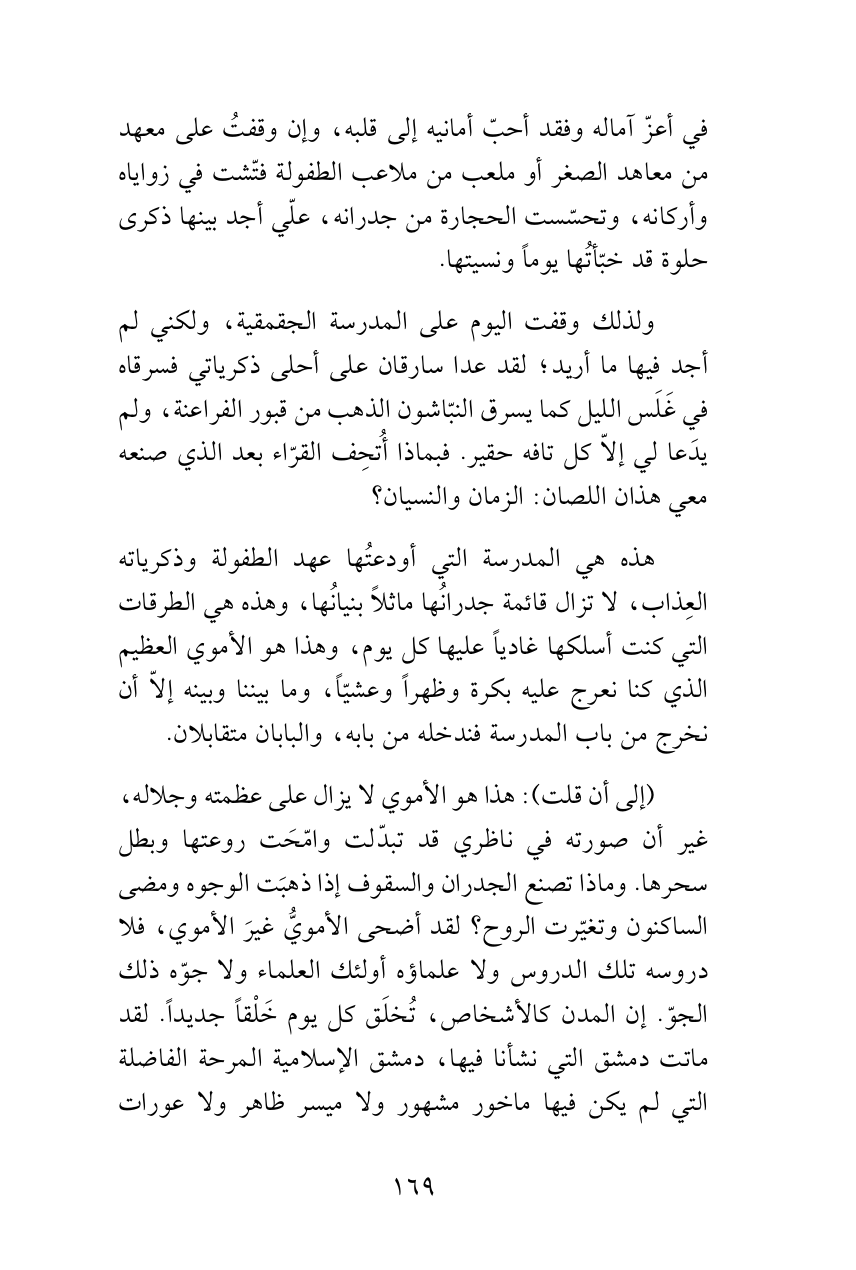 (إلى أن قلت): هذا هو الأموي لا يزال على عظمته وجلاله، غير أن صورته في ناظري قد تبدّلت وامّحَت روعتها وبطل سحرها. وماذا تصنع الجدران والسقوف إذا ذهبَت الوجوه ومضى الساكنون وتغيّرت الروح؟ لقد أضحى الأمويُّ غيرَ الأموي، فلا دروسه تلك الدروس ولا علماؤه أولئك العلماء ولا جوّه ذلك الجوّ. إن المدن كالأشخاص، تُخلَق كل يوم خَلْقاً جديداً. لقد ماتت دمشق التي نشأنا فيها، دمشق الإسلامية المرحة الفاضلة التي لم يكن فيها ماخور مشهور ولا ميسر ظاهر ولا عورات