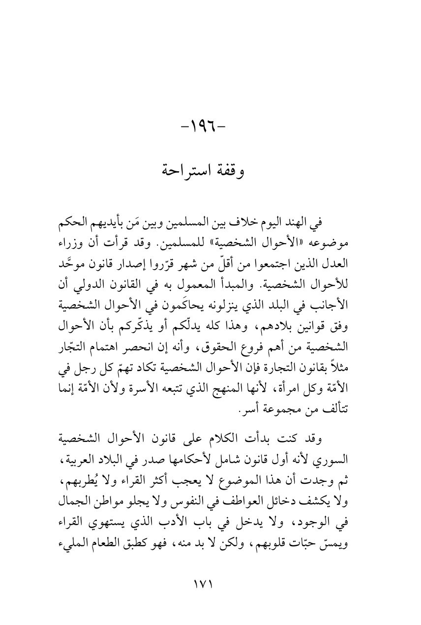 في الهند اليوم خلاف بين المسلمين وبين مَن بأيديهم الحكم موضوعه «الأحوال الشخصية» للمسلمين. وقد قرأت أن وزراء العدل الذين اجتمعوا من أقلّ من شهر قرّروا إصدار قانون موحَّد للأحوال الشخصية. والمبدأ المعمول به في القانون الدولي أن الأجانب في البلد الذي ينزلونه يحاكَمون في الأحوال الشخصية وفق قوانين بلادهم، وهذا كله يدلّكم أو يذكّركم بأن الأحوال الشخصية من أهم فروع الحقوق، وأنه إن انحصر اهتمام التجّار مثلاً بقانون التجارة فإن الأحوال الشخصية تكاد تهمّ كل رجل في الأمّة وكل امرأة، لأنها المنهج الذي تتبعه الأسرة ولأن الأمّة إنما تتألف من مجموعة أسر.