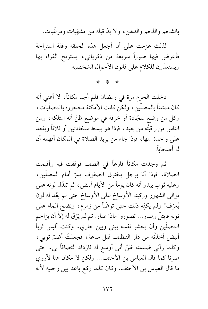 ثم وجدت مكاناً فارغاً في الصف فوقفت فيه وأقيمت الصلاة، فإذا أنا برجل يخترق الصفوف يمرّ أمام المصلّين، وعليه ثوب يبدو أنه كان يوماً من الأيام أبيض، ثم تبدّل لونه على توالي الشهور وركبته الأوساخ على الأوساخ حتى لم يعُد له لون يُعرَف! ولم يكفِه ذلك حتى توضّأ من زمزم، ونضح الماء على ثوبه فابتلّ وصار ... تصوروا ماذا صار. ثم لم يَرُق له إلاّ أن يزاحم المصلّين وأن يحشر نفسه بيني وبين جاري، وكنت ألبس ثوباً أبيض أخذتُه من دار التنظيف قبل ساعة، فجعلتُ أضمّ ثوبي، وكلما رآني ضممته ظنّ أني أوسع له فازداد التصاقاً بي، حتى صرنا كما قال العباسبن الأحنف ... ولكن لا مكان هنا لأروي ما قال العباسبن الأحنف. وكان كلما ركع باعد بين رجليه لأنه