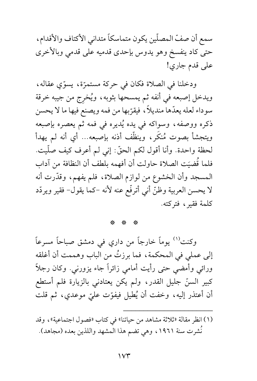 ودخلنا في الصلاة فكان في حركة مستمرّة، يسوّي عقاله، ويدخل إصبعه في أنفه ثم يمسحها بثوبه، ويُخرِج من جيبه خرقة سوداء لعله يعدّها منديلاً، فيقرّبها من فمه ويصنع فيها ما لا يحسن ذكره ووصفه، وسواكه في يده يُديره في فمه ثم يعصره بإصبعه ويتجشأ بصوت مُنكَر، وينظّف أذنه بإصبعه ... أي أنه لم يهدأ لحظة واحدة. وأنا أقول لكم الحقّ: إني لم أعرف كيف صلّيت. فلما قُضيَت الصلاة حاولت أن أفهمه بلطف أن النظافة من آداب المسجد وأن الخشوع من لوازم الصلاة، فلم يفهم، وقدّرت أنه لا يحسن العربية وظنّ أني أترفّع عنه لأنه -كما يقول- فقير ويردّد كلمة فقير، فتركته.