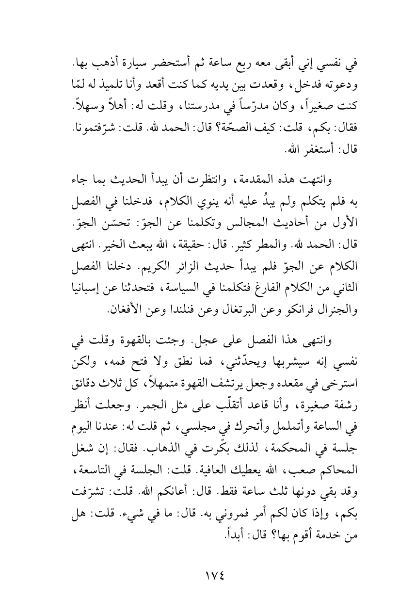 وانتهت هذه المقدمة، وانتظرت أن يبدأ الحديث بما جاء به فلم يتكلم ولم يبدُ عليه أنه ينوي الكلام، فدخلنا في الفصل الأول من أحاديث المجالس وتكلمنا عن الجوّ: تحسّن الجوّ. قال: الحمد لله. والمطر كثير. قال: حقيقة، الله يبعث الخير. انتهى الكلام عن الجوّ فلم يبدأ حديث الزائر الكريم. دخلنا الفصل الثاني من الكلام الفارغ فتكلمنا في السياسة، فتحدثنا عن إسبانيا والجنرال فرانكو وعن البرتغال وعن فنلندا وعن الأفغان.