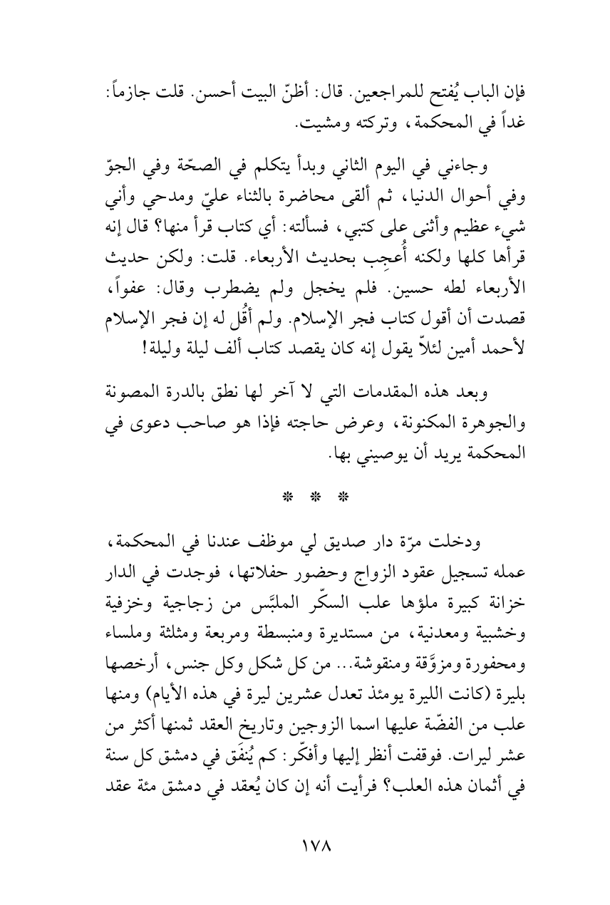 فإن الباب يُفتح للمراجعين. قال: أظنّ البيت أحسن. قلت جازماً: غداً في المحكمة، وتركته ومشيت.