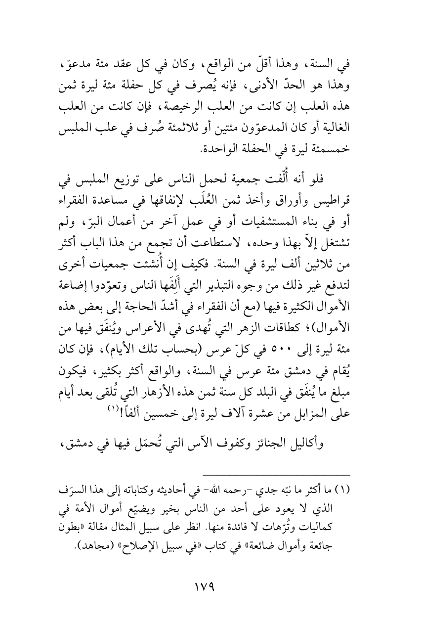 فلو أنه أُلّفت جمعية لحمل الناس على توزيع الملبس في قراطيس وأوراق وأخذ ثمن العُلَب لإنفاقها في مساعدة الفقراء أو في بناء المستشفيات أو في عمل آخر من أعمال البرّ، ولم تشتغل إلاّ بهذا وحده، لاستطاعت أن تجمع من هذا الباب أكثر من ثلاثين ألف ليرة في السنة. فكيف إن أُنشئت جمعيات أخرى لتدفع غير ذلك من وجوه التبذير التي أَلِفَها الناس وتعوّدوا إضاعة الأموال الكثيرة فيها (مع أن الفقراء في أشدّ الحاجة إلى بعض هذه الأموال)؛ كطاقات الزهر التي تُهدى في الأعراس ويُنفَق فيها من مئة ليرة إلى 500 في كلّ عرس (بحساب تلك الأيام)، فإن كان يُقام في دمشق مئة عرس في السنة، والواقع أكثر بكثير، فيكون مبلغ ما يُنفَق في البلد كل سنة ثمن هذه الأزهار التي تُلقى بعد أيام على المزابل من عشرة آلاف ليرة إلى خمسين ألفاً! (¬1)
