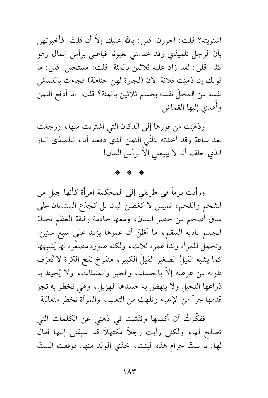 اشتريته؟ قلت: احزرن. قلن: بالله عليك إلاّ أن قلتَ. فأخبرتهن بأن الرجل تلميذي وقد خدمني بعيونه فباعني برأس المال وهو كذا. قلن: لقد زاد عليه ثلاثين بالمئة. قلت: مستحيل. قلن: ما قولك إن ذهبَت فلانة الآن (لجارة لهن خيّاطة) فجاءت بالقماش نفسه من المحلّ نفسه بحسم ثلاثين بالمئة؟ قلت: أنا أدفع الثمن وأُهدي إليها القماش.
