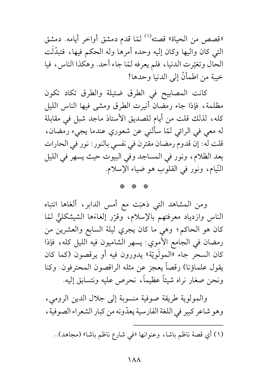 ومن المشاهد التي ذهبَت مع أمس الدابر، ألغاها انتباه الناس وازدياد معرفتهم بالإسلام، وقرّر إلغاءَها الشيشكليُّ لمّا كان هو الحاكم؛ وهي ما كان يجري ليلة السابع والعشرين من رمضان في الجامع الأموي: يسهر الشاميون فيه الليل كله، فإذا كان السحر جاء «المولَويّة» يدورون فيه أو يرقصون (كما كان يقول علماؤنا) رقصاً يعجز عن مثله الراقصون المحترفون. وكنا ونحن صغار نراه شيئاً عظيماً، نحرص عليه ونتسابق إليه.
