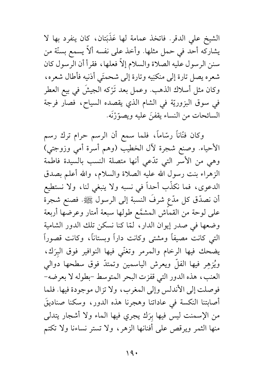 وكان فنّاناً رسّاماً، فلما سمع أن الرسم حرام ترك رسم الأحياء. وصنع شجرة لآل الخطيب (وهم أسرة أمي وزوجتي) وهي من الأسر التي تدّعي أنها متصلة النسب بالسيدة فاطمة الزهراء بنت رسول الله عليه الصلاة والسلام، والله أعلم بصدق الدعوى، فما نكذّب أحداً في نسبه ولا ينبغي لنا، ولا نستطيع أن نصدّق كل مدّعٍ شرفَ النسبة إلى الرسول صلى الله عليه وسلم. فصنع شجرة على لوحة من القماش المشمَّع طولها سبعة أمتار وعرضها أربعة وضعها في صدر إيوان الدار، لمّا كنا نسكن تلك الدور الشامية التي كانت مصيفاً ومشتى وكانت داراً وبستاناً، وكانت قصوراً يضحك فيها الرخام والمرمر وتغنّي فيها النوافير فوق البِرَك، ويُزهِر فيها الفلّ ويعرش الياسمين وتمتدّ فوق سطحها دوالي العنب، هذه الدور التي قفزت البحر المتوسط -بطوله لا بعرضه- فوصلت إلى الأندلس وإلى المغرب، ولا تزال موجودة فيها. فلما أصابتنا النكسة في عاداتنا وهجرنا هذه الدور، وسكنا صناديقَ من الإسمنت ليس فيها بِرَك يجري فيها الماء ولا أشجار يتدلى منها الثمر ويرقص على أفنانها الزهر، ولا تستر نساءنا ولا تكتم