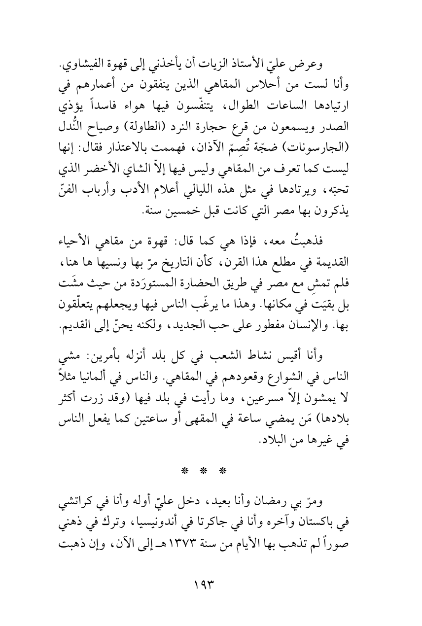 فذهبتُ معه، فإذا هي كما قال: قهوة من مقاهي الأحياء القديمة في مطلع هذا القرن، كأن التاريخ مرّ بها ونسيها ها هنا، فلم تمشِ مع مصر في طريق الحضارة المستورَدة من حيث مشَت بل بقيَت في مكانها. وهذا ما يرغّب الناس فيها ويجعلهم يتعلّقون بها. والإنسان مفطور على حب الجديد، ولكنه يحنّ إلى القديم.