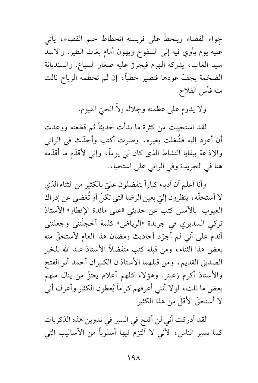 لقد أدركت أني لن أفلح في السير في تدوين هذه الذكريات كما يسير الناس، لأني لا ألتزم فيها أسلوباً من الأساليب التي