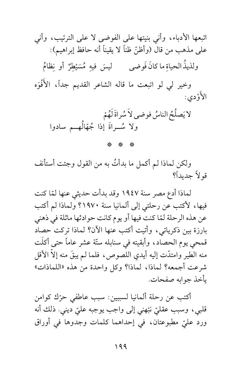 لماذا أدع مصر سنة 1947 وقد بدأت حديثي عنها لمّا كنت فيها، لأكتب عن رحلتي إلى ألمانيا سنة 1970؟ ولماذا لم أكتب عن هذه الرحلة لمّا كنت فيها أو يوم كانت حوادثها ماثلة في ذهني بارزة بين ذكرياتي، وأتيت أكتب عنها الآن؟ لماذا تركت حصاد قمحي يوم الحصاد، وأبقيته في سنابله ستّة عشر عاماً حتى أكلَت منه الطير وامتدّت إليه أيدي اللصوص، فلما لم يبقَ منه إلاّ الأقل شرعت أجمعه؟ لماذا، لماذا؟ وكل واحدة من هذه «اللماذات» يأخذ جوابه صفحات.