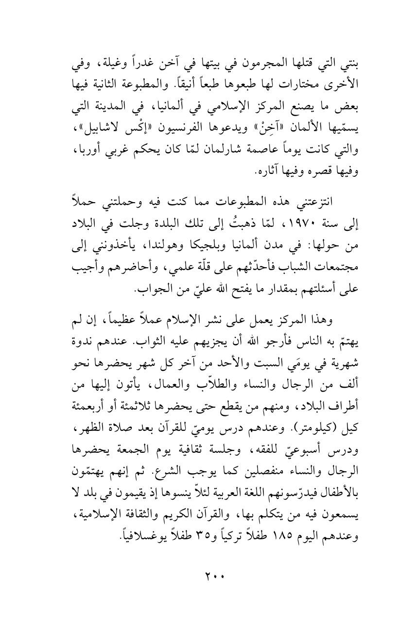 بنتي التي قتلها المجرمون في بيتها في آخن غدراً وغيلة، وفي الأخرى مختارات لها طبعوها طبعاً أنيقاً. والمطبوعة الثانية فيها بعض ما يصنع المركز الإسلامي في ألمانيا، في المدينة التي يسمّيها الألمان «آخِنْ» ويدعوها الفرنسيون «إكْس لاشابيل»، والتي كانت يوماً عاصمة شارلمان لمّا كان يحكم غربي أوربا، وفيها قصره وفيها آثاره.