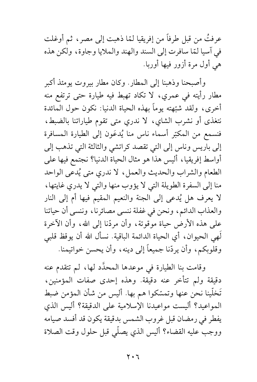 وأصبحنا وذهبنا إلى المطار. وكان مطار بيروت يومئذ أكبر مطار رأيته في عمري، لا تكاد تهبط فيه طيارة حتى ترتفع منه أخرى، ولقد شبّهته يوماً بهذه الحياة الدنيا: نكون حول المائدة نتغذى أو نشرب الشاي، لا ندري متى تقوم طياراتنا بالضبط، فنسمع من المكبّر أسماء ناس منا يُدعَون إلى الطيارة المسافرة إلى باريس وناس إلى التي تقصد كراتشي والثالثة التي تذهب إلى أواسط إفريقيا، أليس هذا هو مثال الحياة الدنيا؟ نجتمع فيها على الطعام والشراب والحديث والعمل، لا ندري متى يُدعى الواحد منا إلى السفرة الطويلة التي لا يؤوب منها والتي لا يدري غايتها، لا يعرف هل يُدعى إلى الجنة والنعيم المقيم فيها أم إلى النار والعذاب الدائم، ونحن في غفلة ننسى مصائرنا، وننسى أن حياتنا على هذه الأرض حياة موقوتة، وأن مردّنا إلى الله، وأن الآخرة لَهي الحيوان، أي الحياة الدائمة الباقية. نسأل الله أن يوقظ قلبي وقلوبكم، وأن يردّنا جميعاً إلى دينه، وأن يحسن خواتيمنا.