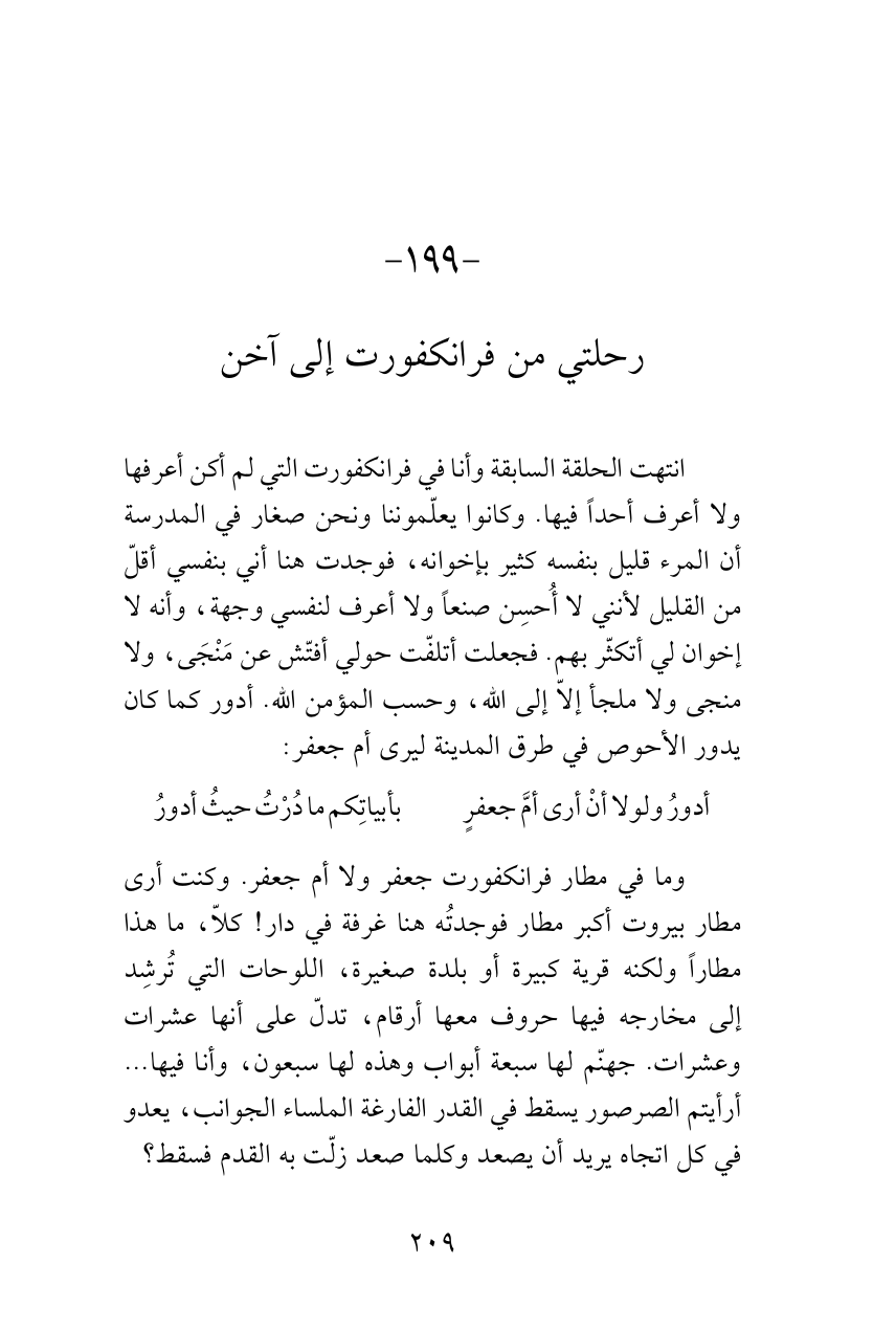 وما في مطار فرانكفورت جعفر ولا أم جعفر. وكنت أرى مطار بيروت أكبر مطار فوجدتُه هنا غرفة في دار! كلاّ، ما هذا مطاراً ولكنه قرية كبيرة أو بلدة صغيرة، اللوحات التي تُرشِد إلى مخارجه فيها حروف معها أرقام، تدلّ على أنها عشرات وعشرات. جهنّم لها سبعة أبواب وهذه لها سبعون، وأنا فيها ... أرأيتم الصرصور يسقط في القدر الفارغة الملساء الجوانب، يعدو في كل اتجاه يريد أن يصعد وكلما صعد زلّت به القدم فسقط؟