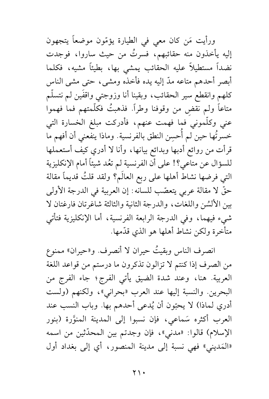 ورأيت مَن كان معي في الطيارة يؤمّون موضعاً يتجهون إليه يأخذون منه حقائبهم، فسرتُ من حيث ساروا، فوجدت نضداً مستطيلاً عليه الحقائب يمشي بها، بطيئاً مشيه، فكلما أبصر أحدهم متاعه مدّ إليه يده فأخذه ومشى، حتى مشى الناس كلهم وانقطع سير الحقائب، وبقينا أنا وزوجتي واقفَين لم نتسلّم متاعاً ولم نقضِ من وقوفنا وطراً. فذهبتُ فكلّمتهم فما فهموا عني وكلّموني فما فهمت عنهم، فأدركت مبلغ الخسارة التي خسرتُها حين لم أُحسِن النطق بالفرنسية. وماذا ينفعني أن أفهم ما قرأت من روائع أدبها وبدائع بيانها، وأنا لا أدري كيف أستعملها للسؤال عن متاعي؟! على أن الفرنسية لم تعُد شيئاً أمام الإنكليزية التي فرضها نشاط أهلها على ربع العالَم؟ ولقد قلتُ قديماً مقالة حقّ لا مقالة عربي يتعصّب للسانه: إن العربية في الدرجة الأولى بين الألسُن واللغات، والدرجة الثانية والثالثة شاغرتان فارغتان لا شيء فيهما، وفي الدرجة الرابعة الفرنسية، أما الإنكليزية فتأتي متأخرة ولكن نشاط أهلها هو الذي قدّمها.