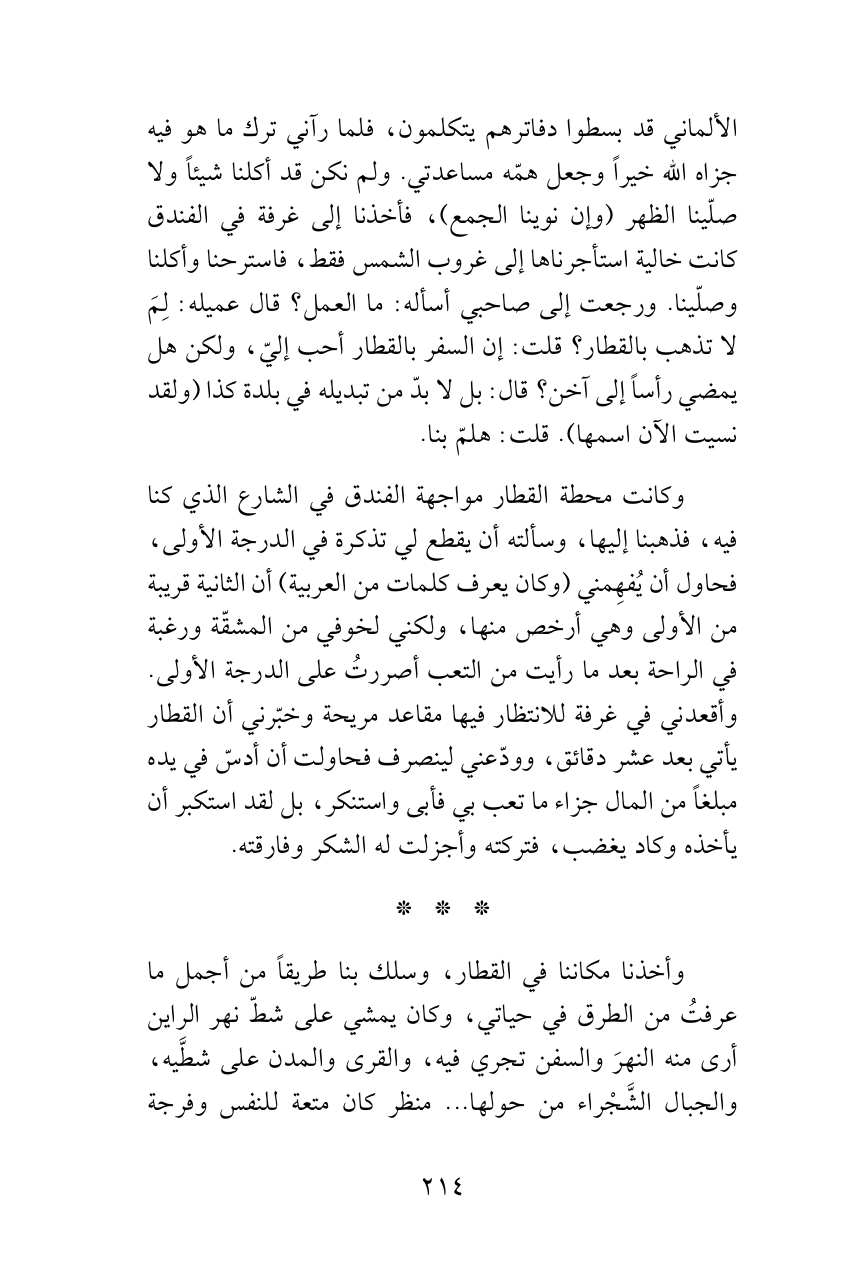 الألماني قد بسطوا دفاترهم يتكلمون، فلما رآني ترك ما هو فيه جزاه الله خيراً وجعل همّه مساعدتي. ولم نكن قد أكلنا شيئاً ولا صلّينا الظهر (وإن نوينا الجمع)، فأخذنا إلى غرفة في الفندق كانت خالية استأجرناها إلى غروب الشمس فقط، فاسترحنا وأكلنا وصلّينا. ورجعت إلى صاحبي أسأله: ما العمل؟ قال عميله: لِمَ لا تذهب بالقطار؟ قلت: إن السفر بالقطار أحب إليّ، ولكن هل يمضي رأساً إلى آخن؟ قال: بل لا بدّ من تبديله في بلدة كذا (ولقد نسيت الآن اسمها). قلت: هلمّ بنا.
