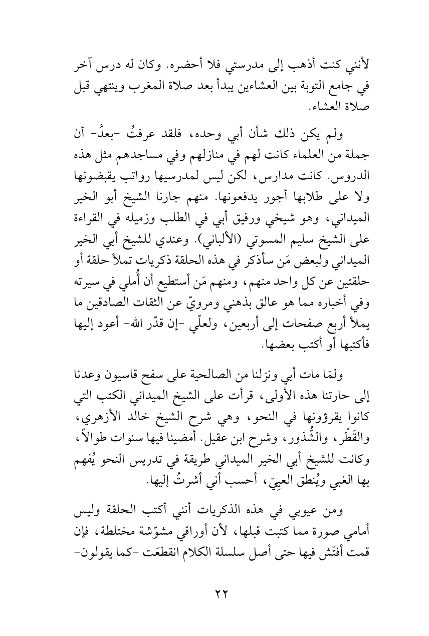 ولم يكن ذلك شأن أبي وحده، فلقد عرفتُ -بعدُ- أن جملة من العلماء كانت لهم في منازلهم وفي مساجدهم مثل هذه الدروس. كانت مدارس، لكن ليس لمدرسيها رواتب يقبضونها ولا على طلابها أجور يدفعونها. منهم جارنا الشيخ أبو الخير الميداني، وهو شيخي ورفيق أبي في الطلب وزميله في القراءة على الشيخ سليم المسوتي (الألباني). وعندي للشيخ أبي الخير الميداني ولبعض مَن سأذكر في هذه الحلقة ذكريات تملأ حلقة أو حلقتين عن كل واحد منهم، ومنهم مَن أستطيع أن أُملي في سيرته وفي أخباره مما هو عالق بذهني ومرويّ عن الثقات الصادقين ما يملأ أربع صفحات إلى أربعين، ولعلّي -إن قدّر الله- أعود إليها فأكتبها أو أكتب بعضها.