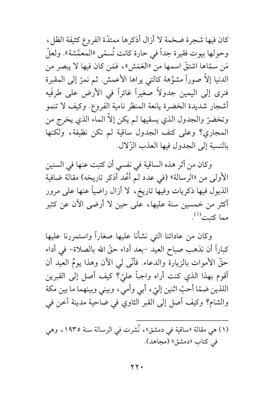 (¬1) هي مقالة «ساقية في دمشق»، نُشرت في الرسالة سنة 1935، وهي في كتاب «دمشق» (مجاهد).