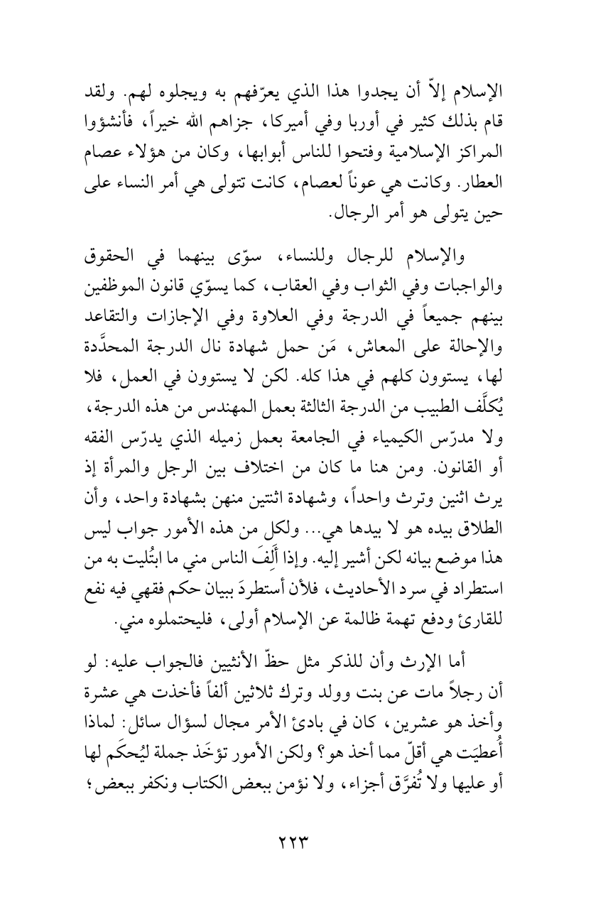 والإسلام للرجال وللنساء، سوّى بينهما في الحقوق والواجبات وفي الثواب وفي العقاب، كما يسوّي قانون الموظفين بينهم جميعاً في الدرجة وفي العلاوة وفي الإجازات والتقاعد والإحالة على المعاش، مَن حمل شهادة نال الدرجة المحدَّدة لها، يستوون كلهم في هذا كله. لكن لا يستوون في العمل، فلا يُكلَّف الطبيب من الدرجة الثالثة بعمل المهندس من هذه الدرجة، ولا مدرّس الكيمياء في الجامعة بعمل زميله الذي يدرّس الفقه أو القانون. ومن هنا ما كان من اختلاف بين الرجل والمرأة إذ يرث اثنين وترث واحداً، وشهادة اثنتين منهن بشهادة واحد، وأن الطلاق بيده هو لا بيدها هي ... ولكل من هذه الأمور جواب ليس هذا موضع بيانه لكن أشير إليه. وإذا أَلِفَ الناس مني ما ابتُليت به من استطراد في سرد الأحاديث، فلأن أستطردَ ببيان حكم فقهي فيه نفع للقارئ ودفع تهمة ظالمة عن الإسلام أولى، فليحتملوه مني.