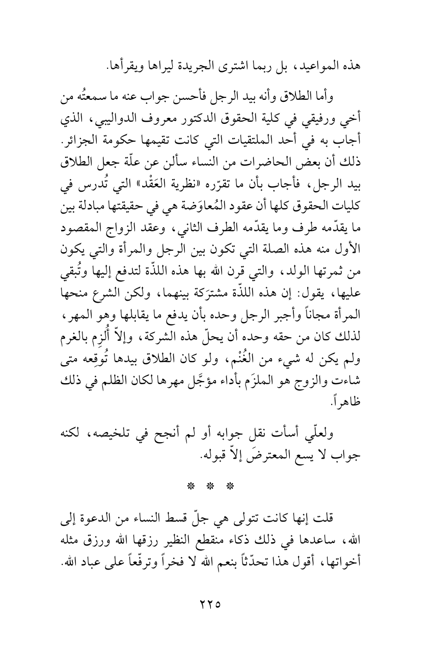 وأما الطلاق وأنه بيد الرجل فأحسن جواب عنه ما سمعتُه من أخي ورفيقي في كلية الحقوق الدكتور معروف الدواليبي، الذي أجاب به في أحد الملتقيات التي كانت تقيمها حكومة الجزائر. ذلك أن بعض الحاضرات من النساء سألن عن علّة جعل الطلاق بيد الرجل، فأجاب بأن ما تقرّره «نظرية العَقْد» التي تُدرس في كليات الحقوق كلها أن عقود المُعاوَضة هي في حقيقتها مبادلة بين ما يقدّمه طرف وما يقدّمه الطرف الثاني، وعقد الزواج المقصود الأول منه هذه الصلة التي تكون بين الرجل والمرأة والتي يكون من ثمرتها الولد، والتي قرن الله بها هذه اللذّة لتدفع إليها وتُبقي عليها، يقول: إن هذه اللذّة مشترَكة بينهما، ولكن الشرع منحها المرأة مجاناً وأجبر الرجل وحده بأن يدفع ما يقابلها وهو المهر، لذلك كان من حقه وحده أن يحلّ هذه الشركة، وإلاّ أُلزِم بالغرم ولم يكن له شيء من الغُنْم، ولو كان الطلاق بيدها تُوقِعه متى شاءت والزوج هو الملزَم بأداء مؤجَّل مهرها لكان الظلم في ذلك ظاهراً.