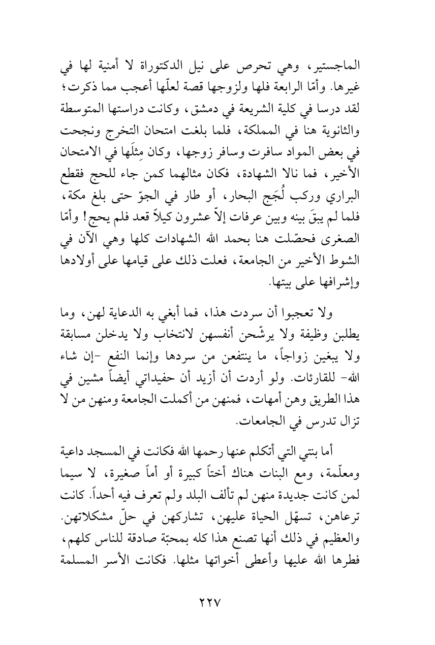الماجستير، وهي تحرص على نيل الدكتوراة لا أمنية لها في غيرها. وأمّا الرابعة فلها ولزوجها قصة لعلّها أعجب مما ذكرت؛ لقد درسا في كلية الشريعة في دمشق، وكانت دراستها المتوسطة والثانوية هنا في المملكة، فلما بلغت امتحان التخرج ونجحت في بعض المواد سافرت وسافر زوجها، وكان مِثلَها في الامتحان الأخير، فما نالا الشهادة، فكان مثالهما كمن جاء للحج فقطع البراري وركب لُجَج البحار، أو طار في الجوّ حتى بلغ مكة، فلما لم يبقَ بينه وبين عرفات إلاّ عشرون كيلاً قعد فلم يحج! وأمّا الصغرى فحصّلت هنا بحمد الله الشهادات كلها وهي الآن في الشوط الأخير من الجامعة، فعلت ذلك على قيامها على أولادها وإشرافها على بيتها.