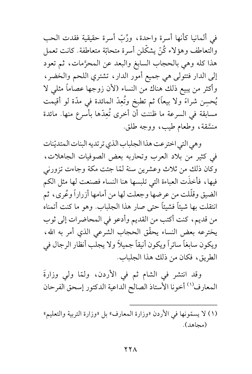 وهي التي اخترعت هذا الجلباب الذي ترتديه البنات المتديّنات في كثير من بلاد العرب وتحاربه بعض الصوفيات الجاهلات، وكان ذلك من ثلاث وعشرين سنة لمّا جئت مكة وجاءت تزورني فيها، فأخذَت العباءة التي تلبسها هنا النساء فصنعت لها مثل الكم الضيق وقلّلت من عرضها وجعلت لها من أمامها أزراراً وعُرى، ثم انتقلت بها شيئاً فشيئاً حتى صار هذا الجلباب. وهو ما كنت أتمناه من قديم، كنت أكتب من القديم وأدعو في المحاضرات إلى ثوب يخترعه بعض النساء يحقّق الحجاب الشرعي الذي أمر به الله، ويكون سابغاً ساتراً ويكون أنيقاً جميلاً ولا يجلب أنظار الرجال في الطريق، فكان من ذلك هذا الجلباب.