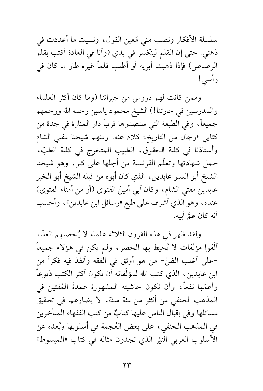 وممن كانت لهم دروس من جيراننا (وما كان أكثر العلماء والمدرسين في حارتنا!) الشيخ محمود ياسين رحمه الله ورحمهم جميعاً، وفي الطبعة التي ستصدرها قريباً دار المنارة في جدة من كتابي «رجال من التاريخ» كلام عنه. ومنهم شيخنا مفتي الشام وأستاذنا في كلية الحقوق، الطبيب المتخرج في كلية الطبّ، حمل شهادتها وتعلّم الفرنسية من أجلها على كبر، وهو شيخنا الشيخ أبو اليسر عابدين، الذي كان أبوه من قبله الشيخ أبو الخير عابدين مفتي الشام، وكان أبي أمينَ الفتوى (أو من أمناء الفتوى) عنده، وهو الذي أشرف على طبع «رسائل ابن عابدين»، وأحسب أنه كان عمَّ أبيه.