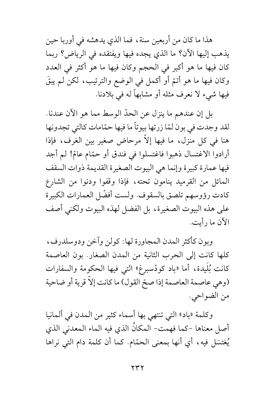 بل إن عندهم ما ينزل عن الحدّ الوسط مما هو الآن عندنا. لقد وجدت في بون لمّا زرتها بيوتاً ما فيها حمّامات كالتي تجدونها هنا في كل منزل، ما فيها إلاّ مرحاض صغير بين الغرف، فإذا أرادوا الاغتسال ذهبوا فاغتسلوا في فندق أو حمّام عامّ! لم أجد فيها عمارة كبيرة وإنما هي البيوت الصغيرة القديمة ذوات السقف المائل من القرميد ينامون تحته، فإذا وقفوا ودنوا من الشارع كادت رؤوسهم تلصق بالسقوف. ولست أفضّل العمارات الكبيرة على هذه البيوت الصغيرة، بل الفضل لهذه البيوت ولكني أصف الآن ما رأيت.