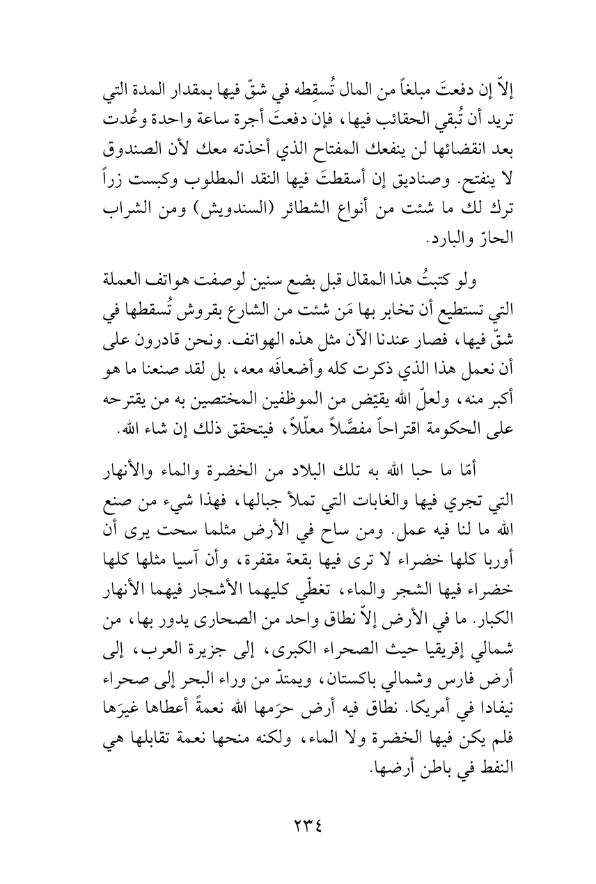 ولو كتبتُ هذا المقال قبل بضع سنين لوصفت هواتف العملة التي تستطيع أن تخابر بها مَن شئت من الشارع بقروش تُسقطها في شقّ فيها، فصار عندنا الآن مثل هذه الهواتف. ونحن قادرون على أن نعمل هذا الذي ذكرت كله وأضعافَه معه، بل لقد صنعنا ما هو أكبر منه، ولعلّ الله يقيّض من الموظفين المختصين به من يقترحه على الحكومة اقتراحاً مفصَّلاً معلّلاً، فيتحقق ذلك إن شاء الله.