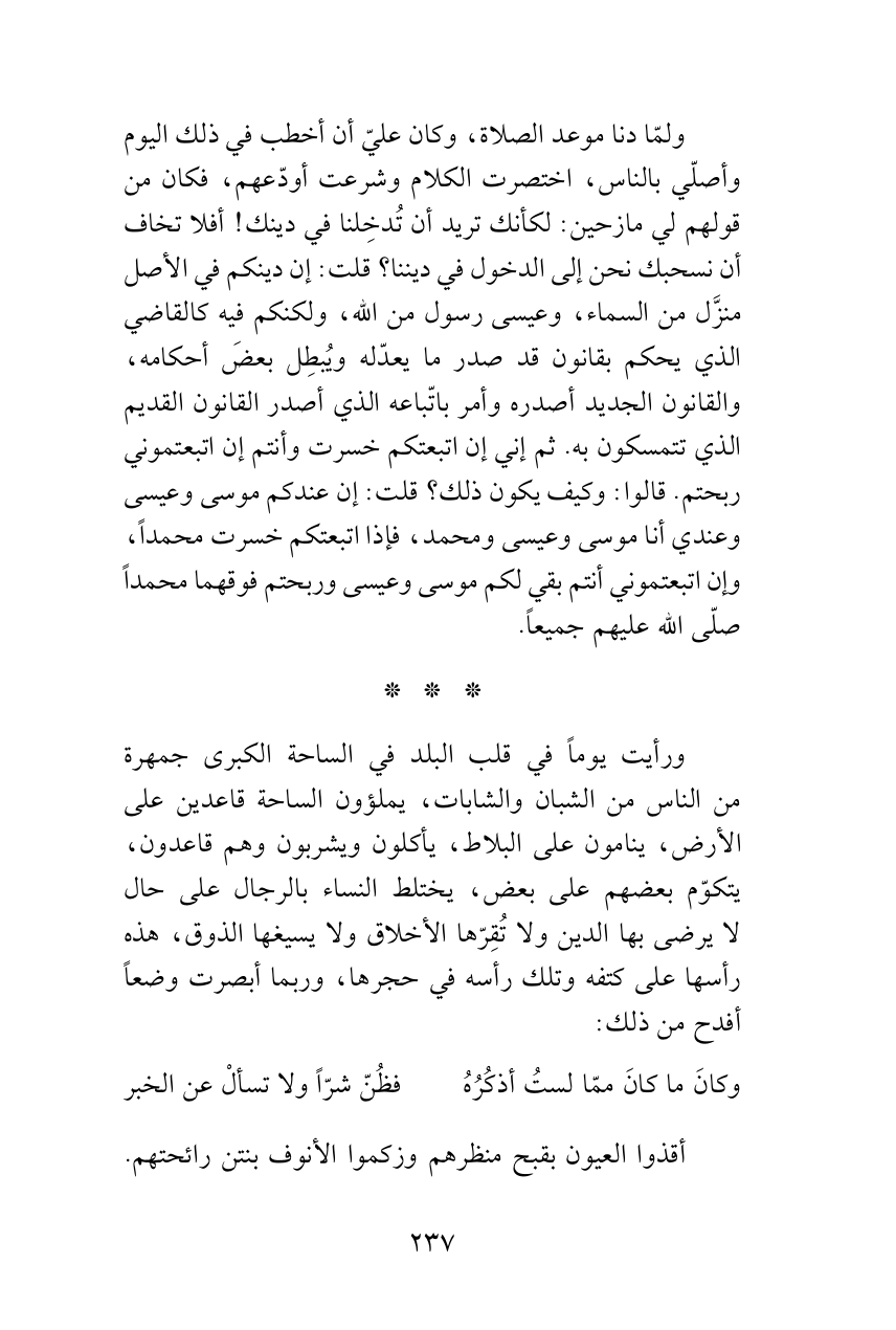 ولمّا دنا موعد الصلاة، وكان عليّ أن أخطب في ذلك اليوم وأصلّي بالناس، اختصرت الكلام وشرعت أودّعهم، فكان من قولهم لي مازحين: لكأنك تريد أن تُدخِلنا في دينك! أفلا تخاف أن نسحبك نحن إلى الدخول في ديننا؟ قلت: إن دينكم في الأصل منزَّل من السماء، وعيسى رسول من الله، ولكنكم فيه كالقاضي الذي يحكم بقانون قد صدر ما يعدّله ويُبطِل بعضَ أحكامه، والقانون الجديد أصدره وأمر باتّباعه الذي أصدر القانون القديم الذي تتمسكون به. ثم إني إن اتبعتكم خسرت وأنتم إن اتبعتموني ربحتم. قالوا: وكيف يكون ذلك؟ قلت: إن عندكم موسى وعيسى وعندي أنا موسى وعيسى ومحمد، فإذا اتبعتكم خسرت محمداً، وإن اتبعتموني أنتم بقي لكم موسى وعيسى وربحتم فوقهما محمداً صلّى الله عليهم جميعاً.