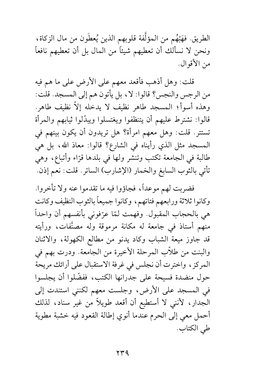 قلت: وهل أذهب فأقعد معهم على الأرض على ما هم فيه من الرجس والنجس؟ قالوا: لا، بل يأتون هم إلى المسجد. قلت: وهذه أسوأ؛ المسجد طاهر نظيف لا يدخله إلاّ نظيف طاهر. قالوا: نشترط عليهم أن يتنظفوا ويغتسلوا ويبدّلوا ثيابهم والمرأة تستتر. قلت: وهل معهم امرأة؟ هل تريدون أن يكون بينهم في المسجد مثل الذي رأيناه في الشارع؟ قالوا: معاذ الله، بل هي طالبة في الجامعة تكتب وتنشر ولها في بلدها قرّاء وأتباع، وهي تأتي بالثوب السابغ والخمار (الإشارب) الساتر. قلت: نعم إذن.