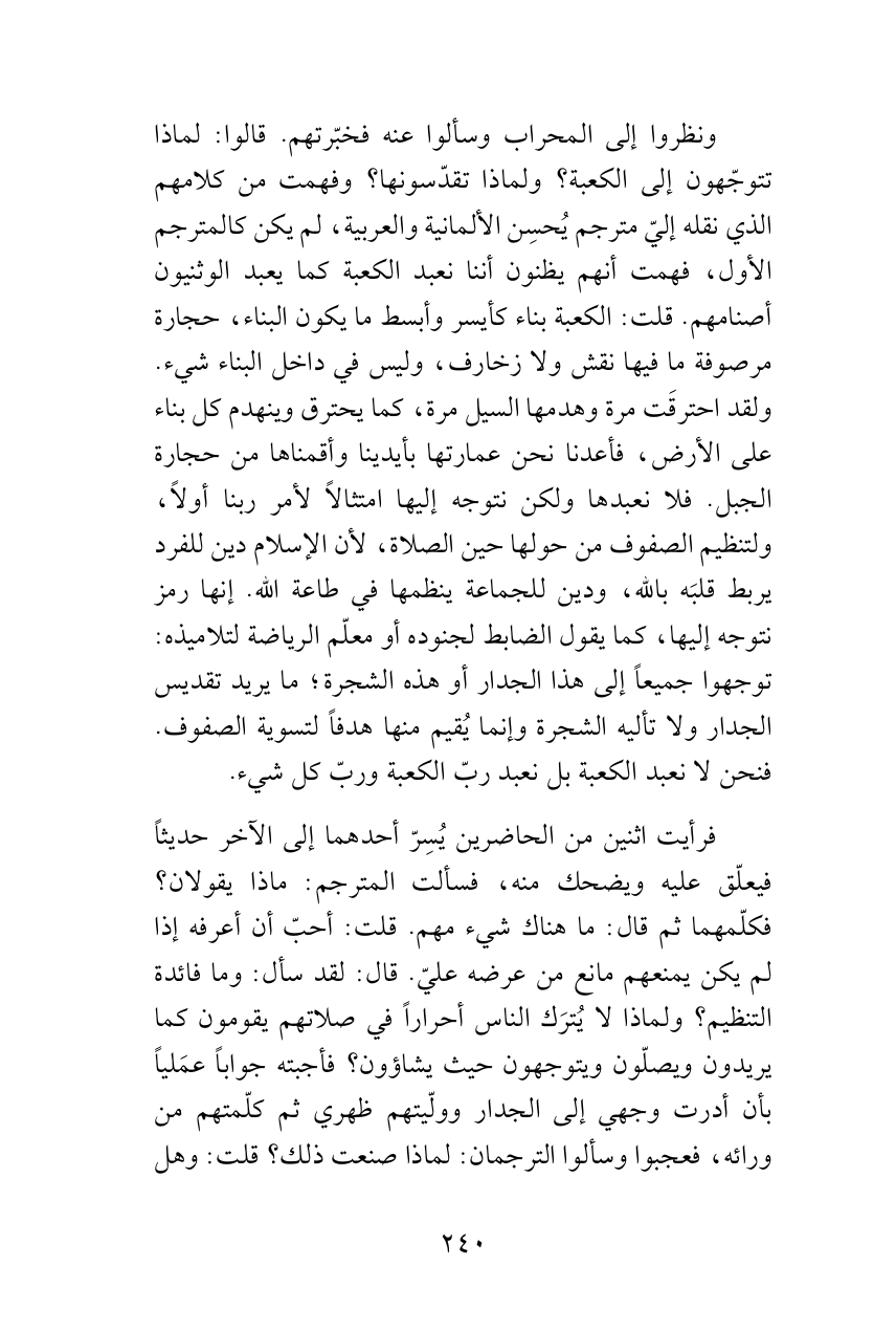 ونظروا إلى المحراب وسألوا عنه فخبّرتهم. قالوا: لماذا تتوجّهون إلى الكعبة؟ ولماذا تقدّسونها؟ وفهمت من كلامهم الذي نقله إليّ مترجم يُحسِن الألمانية والعربية، لم يكن كالمترجم الأول، فهمت أنهم يظنون أننا نعبد الكعبة كما يعبد الوثنيون أصنامهم. قلت: الكعبة بناء كأيسر وأبسط ما يكون البناء، حجارة مرصوفة ما فيها نقش ولا زخارف، وليس في داخل البناء شيء. ولقد احترقَت مرة وهدمها السيل مرة، كما يحترق وينهدم كل بناء على الأرض، فأعدنا نحن عمارتها بأيدينا وأقمناها من حجارة الجبل. فلا نعبدها ولكن نتوجه إليها امتثالاً لأمر ربنا أولاً، ولتنظيم الصفوف من حولها حين الصلاة، لأن الإسلام دين للفرد يربط قلبَه بالله، ودين للجماعة ينظمها في طاعة الله. إنها رمز نتوجه إليها، كما يقول الضابط لجنوده أو معلّم الرياضة لتلاميذه: توجهوا جميعاً إلى هذا الجدار أو هذه الشجرة؛ ما يريد تقديس الجدار ولا تأليه الشجرة وإنما يُقيم منها هدفاً لتسوية الصفوف. فنحن لا نعبد الكعبة بل نعبد ربّ الكعبة وربّ كل شيء.