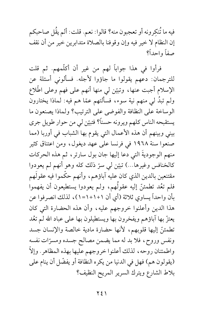 فرأوا في هذا جواباً لهم من غير أن أكلّمهم. ثم قلت للترجمان: دعهم يقولوا ما جاؤوا لأجله. فسألوني أسئلة عن الإسلام أجبت عنها، وتبيّن لي منها أنهم على فهم وعلى اطّلاع ولم تبدُ لي منهم نية سوء، فسألتهم عمّا هم فيه: لماذا يختارون الوساخة على النظافة والفوضى على الترتيب؟ ولماذا يصنعون ما يستقبحه الناس كلهم ويرونه حسناً؟ فتبيّن لي من حوار طويل جرى بيني وبينهم أن هذه الأعمال التي يقوم بها الشباب في أوربا (مما صنعوا سنة 1968 في فرنسا على عهد ديغول، ومن اعتناق كثير منهم الوجوديةَ التي دعا إليها جان بول سارتر، ثم هذه الحركات كالخنافس وغيرها ...) تبيّن لي سرّ ذلك كله وهو أنهم لم يعودوا مقتنعين بالدين الذي كان عليه آباؤهم، وأنهم حكّموا فيه عقولَهم فلم تعُد تطمئنّ إليه عقولُهم، ولم يعودوا يستطيعون أن يفهموا بأن واحداً يساوي ثلاثة (أي أن 1+1+1=1)، لذلك انصرفوا عن هذا الدين وأعلنوا خروجهم عليه، وأن هذه الحضارة التي كان يعتزّ بها آباؤهم ويفخرون بها ويستطيلون بها على عباد الله لم تعُد تطمئنّ إليها قلوبهم، لأنها حضارة مادية خالصة والإنسان جسد ونفس وروح، فلا بد له مما يضمن مصالح جسده ومسرّات نفسه واطمئنان روحه، لذلك أعلنوا خروجهم عليها بهذه المظاهر. وإلاّ (يقولون هم) فهل في الدنيا من يكره النظافة أو يفضّل أن ينام على بلاط الشارع ويترك السرير المريح النظيف؟