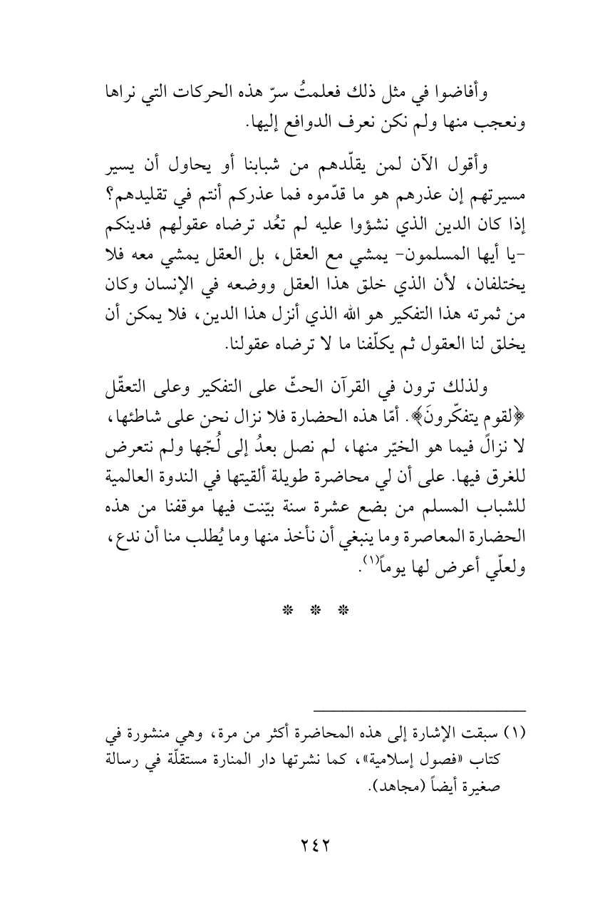 (¬1) سبقت الإشارة إلى هذه المحاضرة أكثر من مرة، وهي منشورة في كتاب «فصول إسلامية»، كما نشرتها دار المنارة مستقلّة في رسالة صغيرة أيضاً (مجاهد).