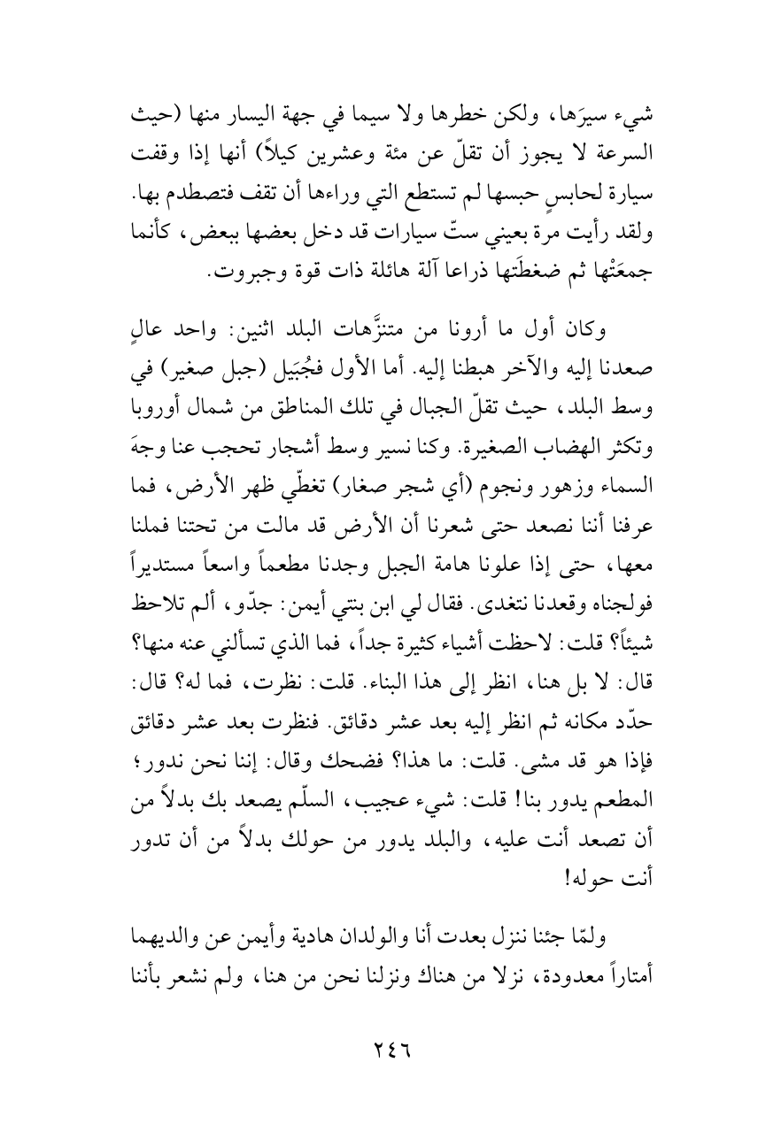 وكان أول ما أرونا من متنزَّهات البلد اثنين: واحد عالٍ صعدنا إليه والآخر هبطنا إليه. أما الأول فجُبَيل (جبل صغير) في وسط البلد، حيث تقلّ الجبال في تلك المناطق من شمال أوروبا وتكثر الهضاب الصغيرة. وكنا نسير وسط أشجار تحجب عنا وجهَ السماء وزهور ونجوم (أي شجر صغار) تغطّي ظهر الأرض، فما عرفنا أننا نصعد حتى شعرنا أن الأرض قد مالت من تحتنا فملنا معها، حتى إذا علونا هامة الجبل وجدنا مطعماً واسعاً مستديراً فولجناه وقعدنا نتغدى. فقال لي ابن بنتي أيمن: جدّو، ألم تلاحظ شيئاً؟ قلت: لاحظت أشياء كثيرة جداً، فما الذي تسألني عنه منها؟ قال: لا بل هنا، انظر إلى هذا البناء. قلت: نظرت، فما له؟ قال: حدّد مكانه ثم انظر إليه بعد عشر دقائق. فنظرت بعد عشر دقائق فإذا هو قد مشى. قلت: ما هذا؟ فضحك وقال: إننا نحن ندور؛ المطعم يدور بنا! قلت: شيء عجيب، السلّم يصعد بك بدلاً من أن تصعد أنت عليه، والبلد يدور من حولك بدلاً من أن تدور أنت حوله!