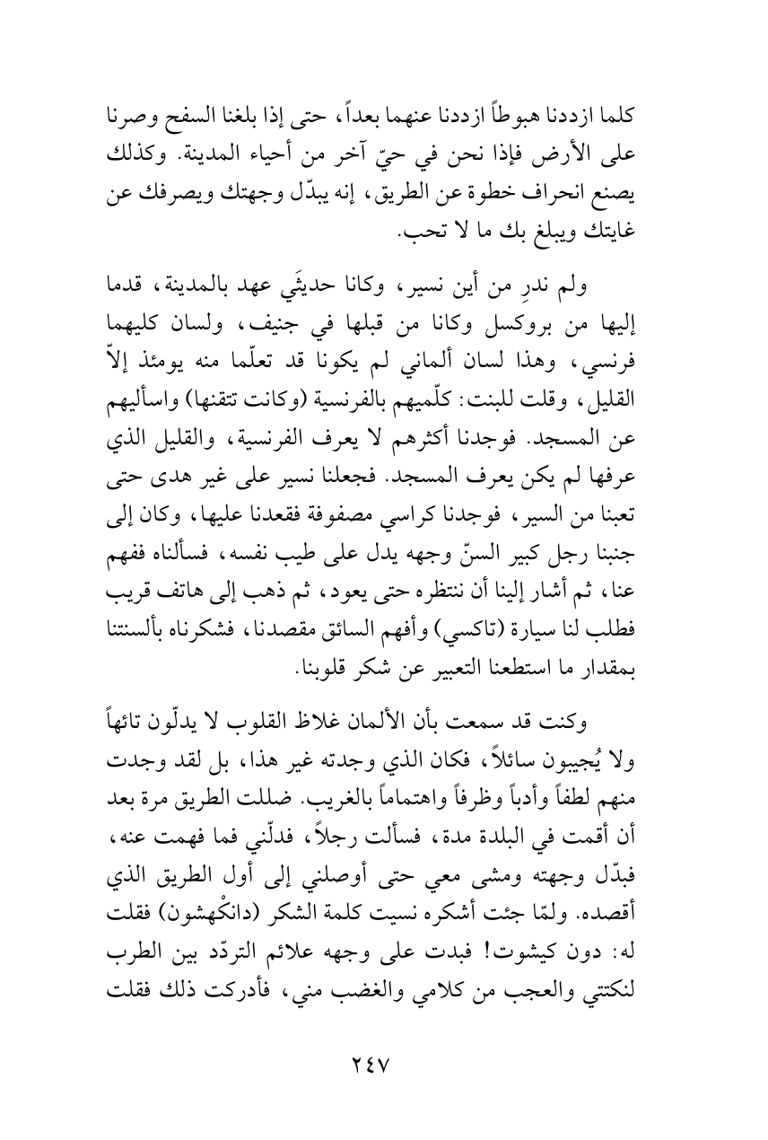 وكنت قد سمعت بأن الألمان غلاظ القلوب لا يدلّون تائهاً ولا يُجيبون سائلاً، فكان الذي وجدته غير هذا، بل لقد وجدت منهم لطفاً وأدباً وظرفاً واهتماماً بالغريب. ضللت الطريق مرة بعد أن أقمت في البلدة مدة، فسألت رجلاً، فدلّني فما فهمت عنه، فبدّل وجهته ومشى معي حتى أوصلني إلى أول الطريق الذي أقصده. ولمّا جئت أشكره نسيت كلمة الشكر (دانكْهشون) فقلت له: دون كيشوت! فبدت على وجهه علائم التردّد بين الطرب لنكتتي والعجب من كلامي والغضب مني، فأدركت ذلك فقلت