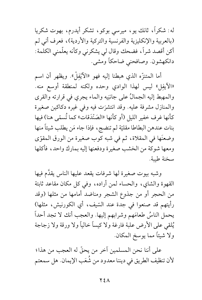 أما المتنزّه الذي هبطنا إليه فهو «الآيْفِلْ». ويظهر أن اسم «الآيفِل» ليس لهذا الوادي وحده ولكنه لمنطقة أوسع منه. والمهبط إليه الجمالُ على جانبَيه والماء يجري في قرارته والقرى والمنازل مشرفة عليه. وقد انتشرَت فيه وفي غيره دكاكين صغيرة كأنها غرف خفير الليل (أو كأنها «الصَنْدَقات» كما تُسمّى هنا) فيها بنات عندهن البطاطا مقليّة لم تنضج، فإذا جاء مَن يطلب شيئاً منها وضعنَها في المقلاة، ثم في شبه كوب صغيرة من الورق المقوّى ومعها شوكة من الخشب صغيرة ودفعنها إليه بمارك واحد، فأكلها سخنة طيبة.