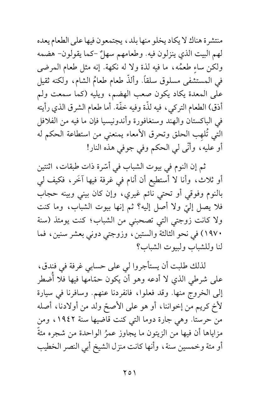 ثم إن النوم في بيوت الشباب في أسّرة ذات طبقات، اثنتين أو ثلاث، وأنا لا أستطيع أن أنام في غرفة فيها آخَر، فكيف لي بالنوم وفوقي أو تحتي نائم غيري، وإن كان بيني وبينه حجاب فلا يصل إليّ ولا أصل إليه؟ ثم إنها بيوت الشباب، وما كنت ولا كانت زوجتي التي تصحبني من الشباب؛ كنت يومئذ (سنة 1970) في نحو الثالثة والستين، وزوجتي دوني بعشر سنين، فما لنا وللشباب ولبيوت الشباب؟