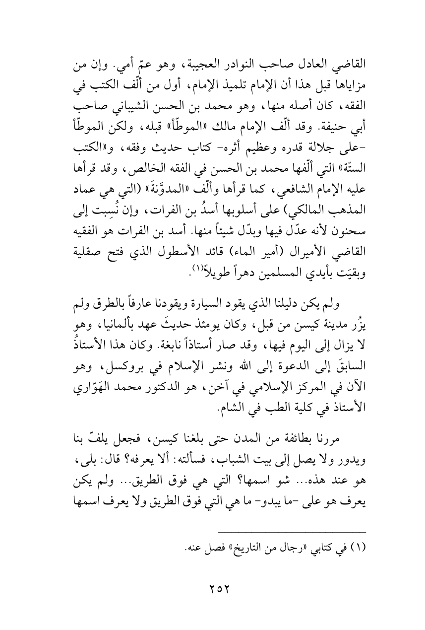 القاضي العادل صاحب النوادر العجيبة، وهو عمّ أمي. وإن من مزاياها قبل هذا أن الإمام تلميذ الإمام، أول من ألّف الكتب في الفقه، كان أصله منها، وهو محمدبن الحسن الشيباني صاحب أبي حنيفة. وقد ألّف الإمام مالك «الموطّأ» قبله، ولكن الموطّأ -على جلالة قدره وعظيم أثره- كتاب حديث وفقه، و «الكتب الستّة» التي ألّفها محمدبن الحسن في الفقه الخالص، وقد قرأها عليه الإمام الشافعي، كما قرأها وألّف «المدوَّنةَ» (التي هي عماد المذهب المالكي) على أسلوبها أسدُبن الفرات، وإن نُسِبت إلى سحنون لأنه عدّل فيها وبدّل شيئاً منها. أسدبن الفرات هو الفقيه القاضي الأميرال (أمير الماء) قائد الأسطول الذي فتح صقلية وبقيَت بأيدي المسلمين دهراً طويلاً (¬1).