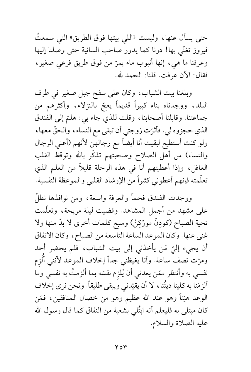وبلغنا بيت الشباب، وكان على سفح جبل صغير في طرف البلد، ووجدناه بناء كبيراً قديماً يعجّ بالنزلاء، وأكثرهم من جماعتنا. وقابلنا أصحابنا، وقلت للذي جاء بي: هلمّ إلى الفندق الذي حجزوه لي. فآثرَت زوجتي أن تبقى مع النساء، والحقّ معها، ولو كنت أستطيع لبقيت أنا أيضاً مع رجالهن لأنهم (أعني الرجال والنساء) من أهل الصلاح وصحبتهم تذكّر بالله وتوقظ القلب الغافل، وإذا أعطيتهم أنا في هذه الرحلة قليلاً من العلم الذي تعلّمته فإنهم أعطوني كثيراً من الإرشاد القلبي والموعظة النفسية.